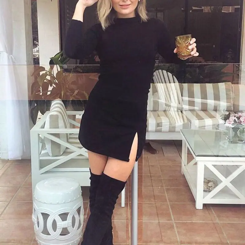 Bargain Winter Women Dress Sexy Turtleneck Long Sleeve Slim Dress Office Lady Bag Hip Split Solid Color Min