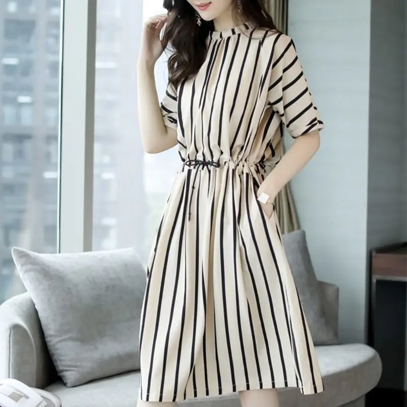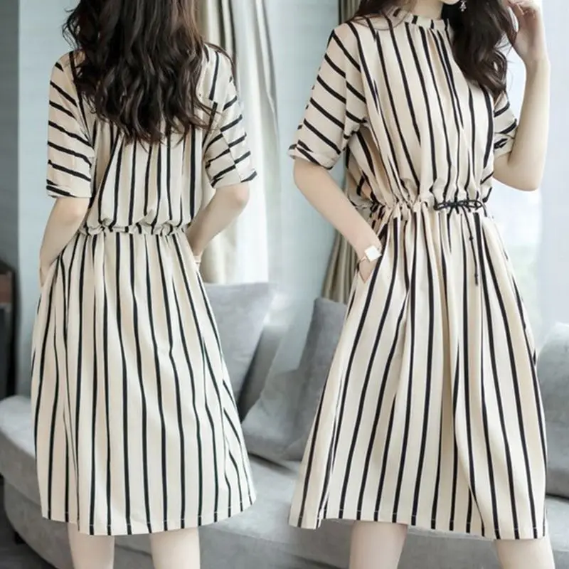 Best Offer Womens Plus Size Half Sleeves Striped Midi Dress Round Neck Button Up High Waist Drawstring Office | Women Sleeveless Floral Print Summer Beach Swing Loose Vest Dress Plus Size