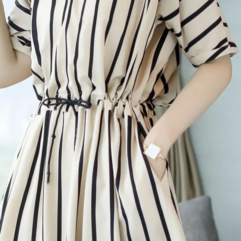 Cheap Womens Plus Size Half Sleeves Striped Midi Dress Round Neck Button Up High Waist Drawstring Office