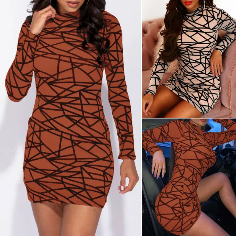 Clearance Fashion Womens Dress Sexy Mesh Sheer High Neck Print Geometric Lines Long Sleeve Mesh Dress Casual