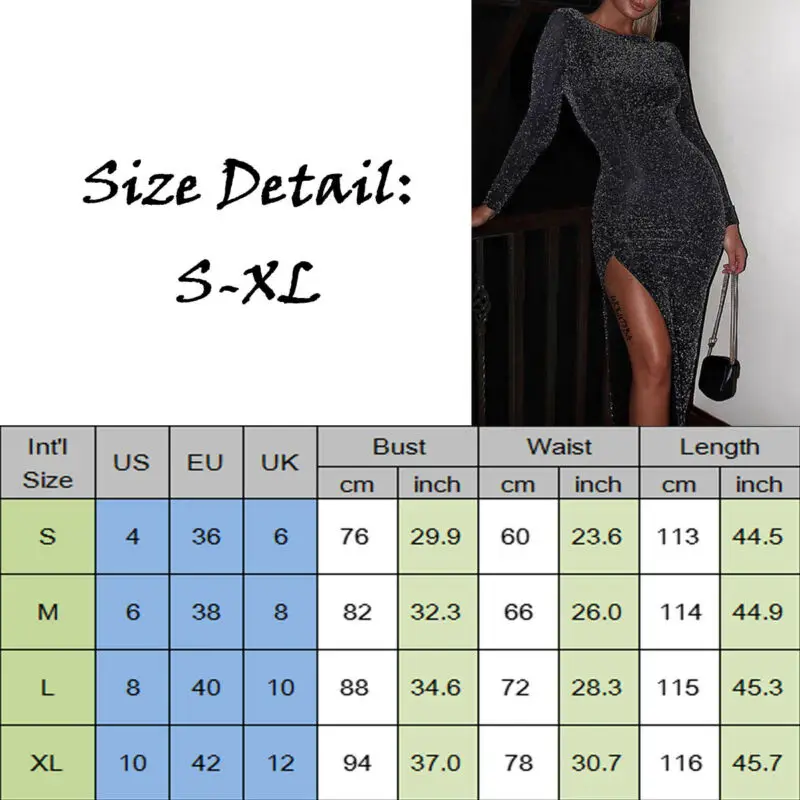 Discount Sexy Womens Long Sleeve Sequins Shimmer Dress Evening Party Slim High Waist Solid Color Midi Dress