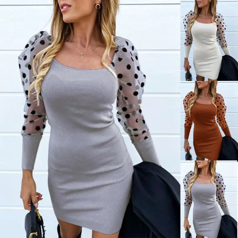 Promo Sexy Women's Sheer Puff Perspective Long Sleeve Mini Dress O-Neck Polka Dots Slim Fit Empire Pencil