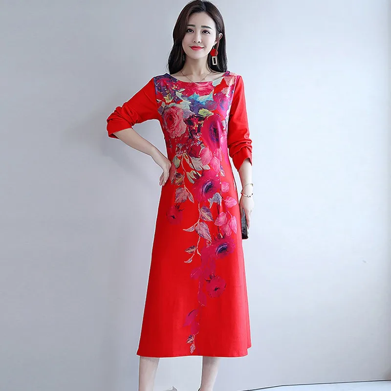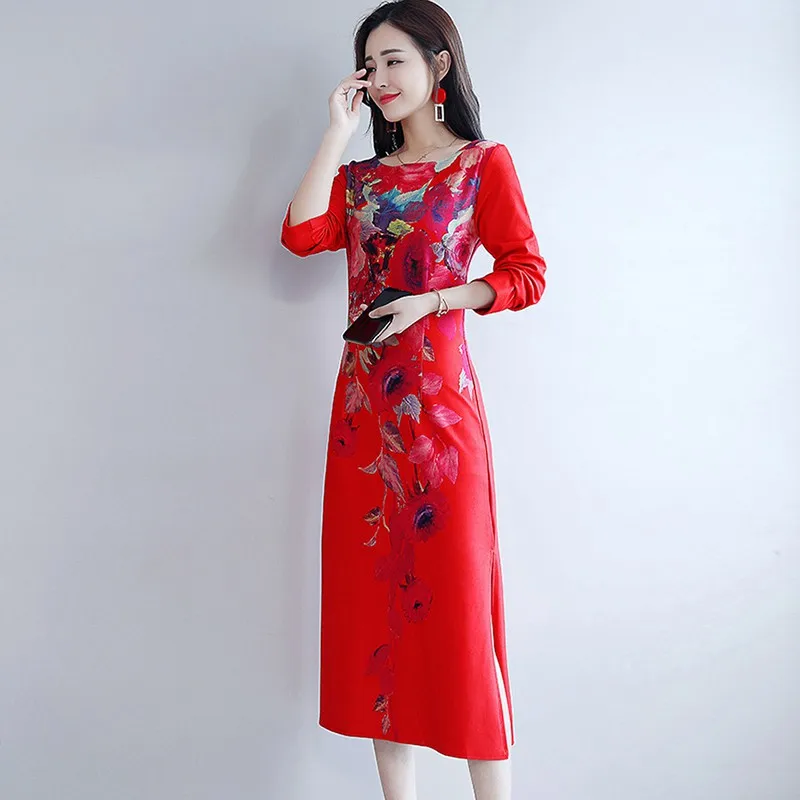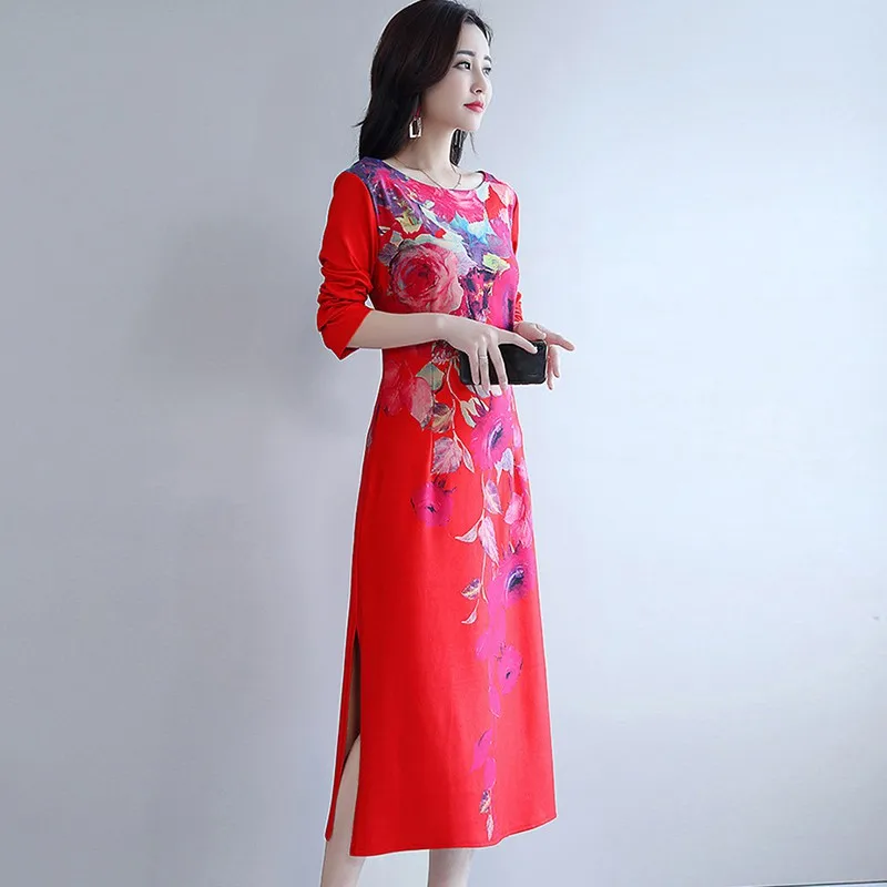 Affordable Women Long Sleeve Slim Split Dress Retro Round Neck Flower Printed Dresses